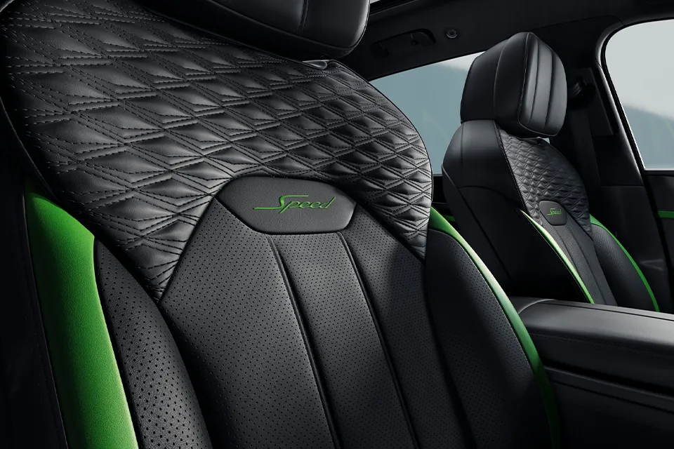 Ghế ngồi, tapi cửa... được trang trí bởi họa tiết đường chỉ may hình kim cương Precision Diamond hoàn toàn mới. Logo Speed được thêu tỉ mỉ tại tựa lưng mỗi ghế.