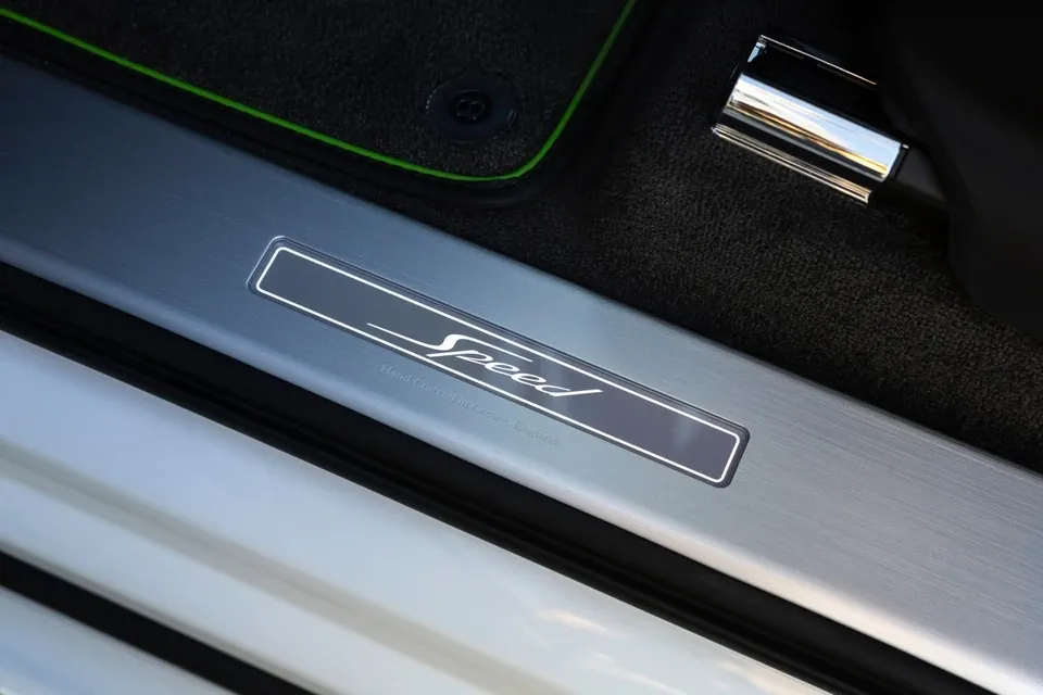 Bệ bước có logo "Speed" phát sáng, đi kèm dòng chữ dập chìm "Hand Crafted in Crewe, England" (Chế tác thủ công tại Crewe, Anh Quốc).