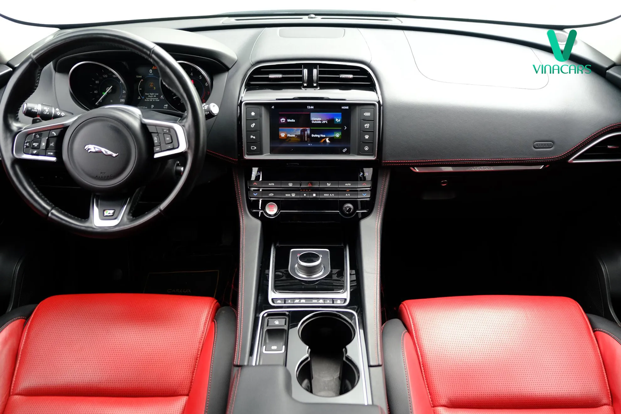 Khoang nội thất của Jaguar F-Pace R-Sport 2016 mang đậm phong cách Jaguar với sự kết hợp giữa sang trọng, hiện đại và tập trung vào người lái. Chất liệu cao cấp như da Taurus, Suede và các chi tiết ốp nhôm, đen bóng tạo cảm giác thể thao và tinh tế.
