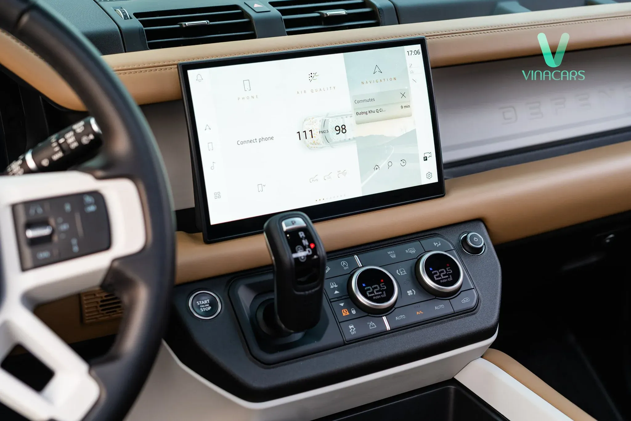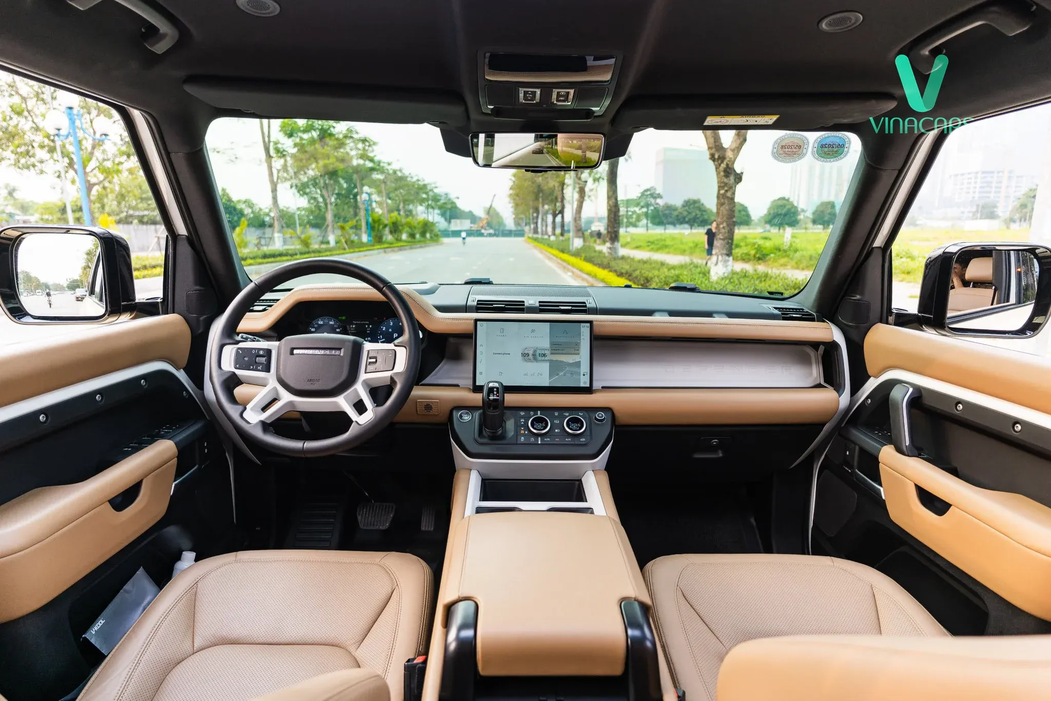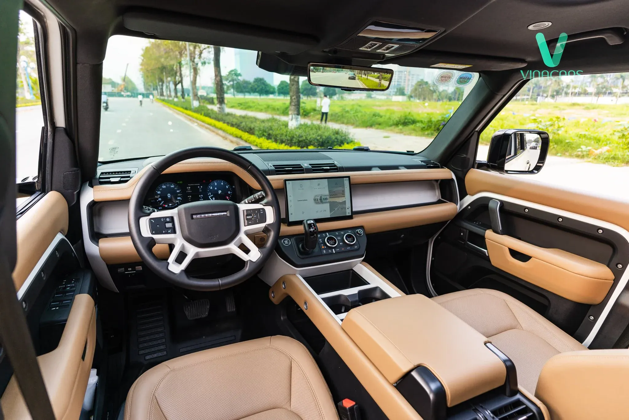 Mở cửa bước vào trong, Defender 130 X-Dynamic S tiếp tục mang đến một bữa tiệc thị giác với tông màu be/kem đồng điệu hoàn hảo cùng ngoại thất, đan xen cùng các mảng ốp đen nhám mạnh mẽ.