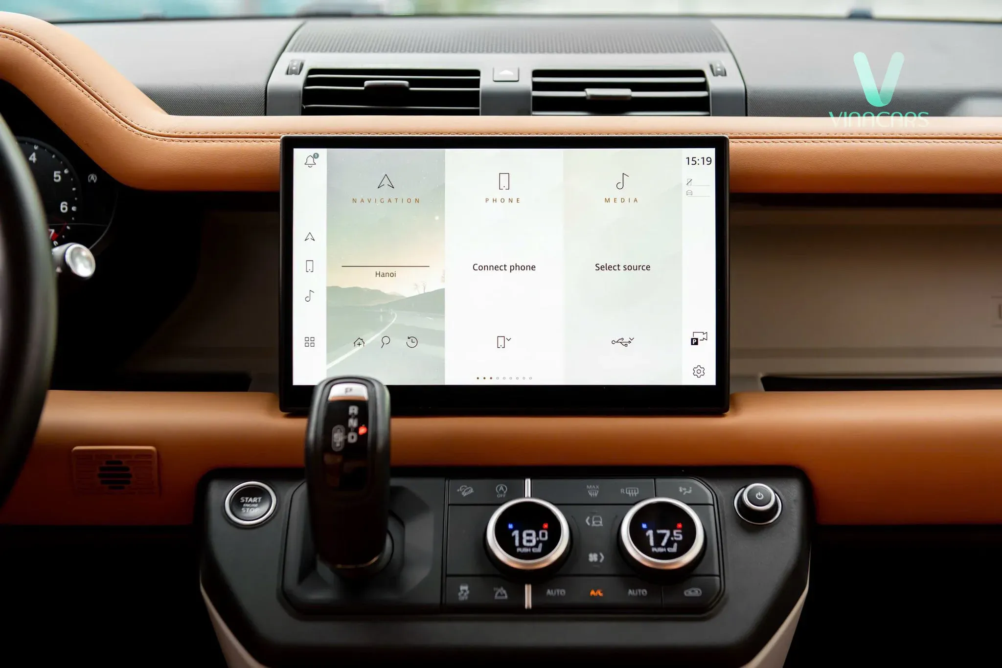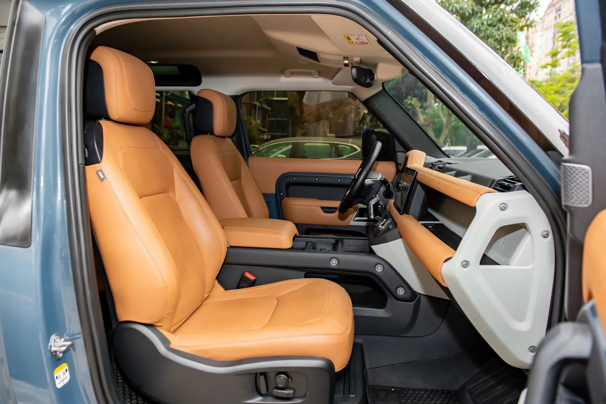 Khoang nội thất bọc da cao cấp màu da bò (Vintage Tan) mang lại cảm giác vô cùng ấm áp và sang trọng, tương phản tinh tế với các chi tiết ốp màu sáng trên bảng điều khiển.
