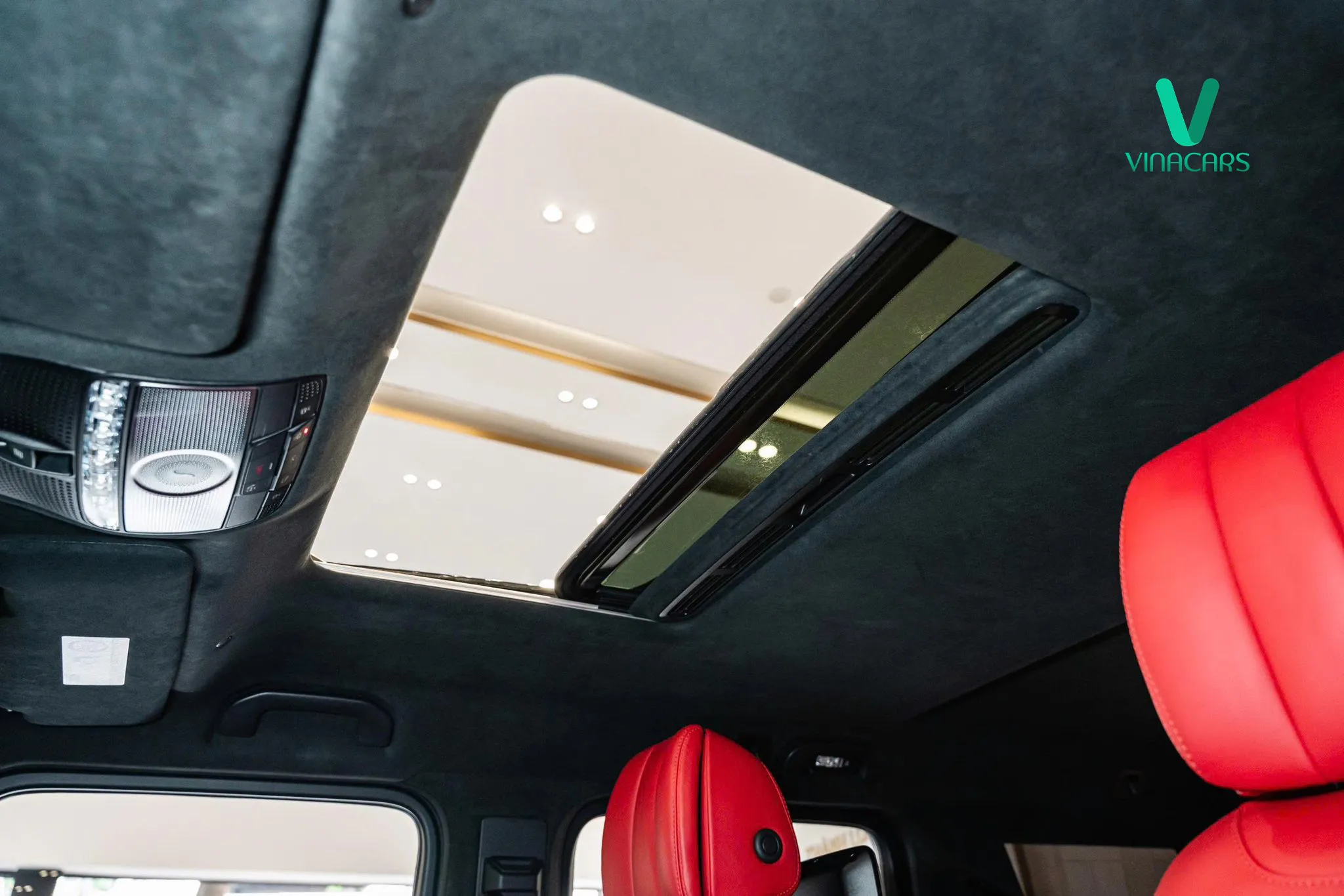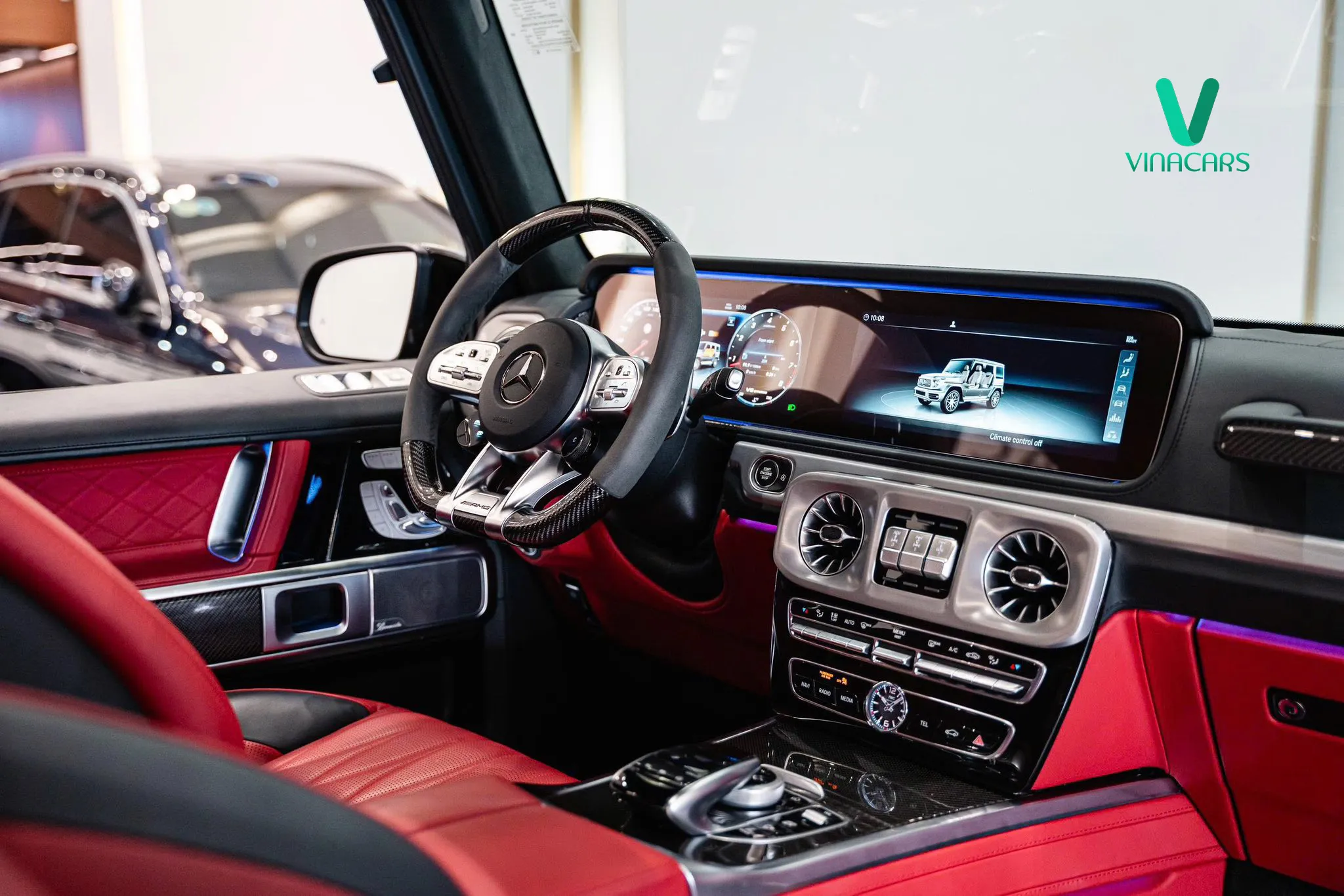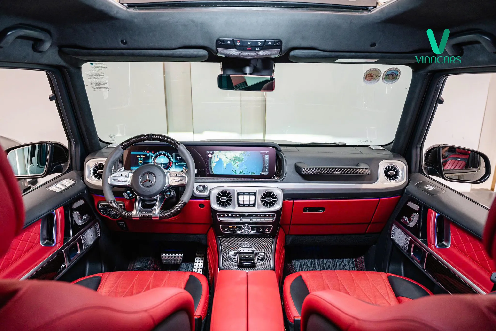 Không gian nội thất của G63 2021 là sự kết hợp giữa vẻ sang trọng truyền thống và công nghệ hiện đại. Khoang lái rộng rãi và được bọc da Nappa cao cấp với các đường chỉ khâu tỉ mỉ. Điểm nhấn độc quyền của phiên bản này là phối màu nội thất hai tông màu (Thường là xám titan ngọc trai/đen), Táp-lô cũng được bọc da hai tông màu tương ứng.