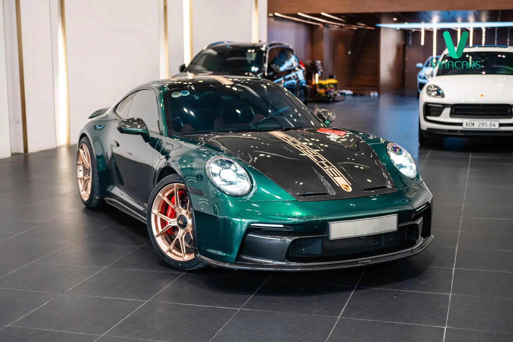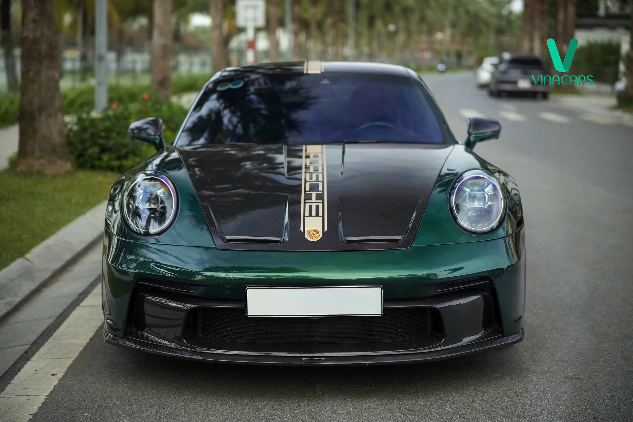 911 GT3 Carrera gây ấn tượng mạnh mẽ ngay từ cái nhìn đầu tiên với màu sơn Brewster Green thuộc chương trình cá nhân hóa Paint to Sample (PTS), mang lại vẻ ngoài vừa cổ điển vừa quyền lực.