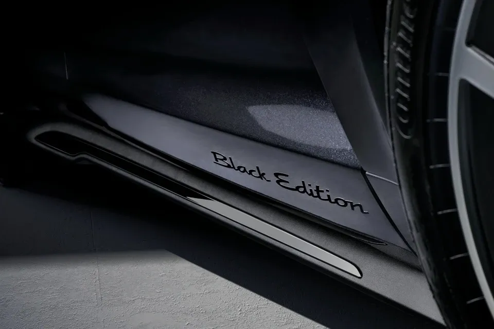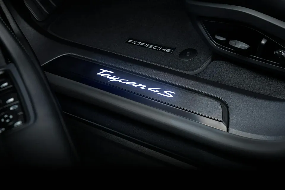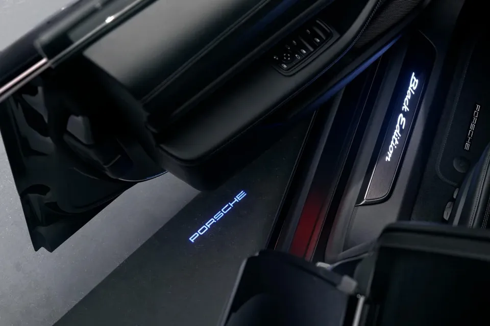 Bậc cửa được trang trí với huy hiệu phát sáng cùng bề mặt nhôm phay màu đen. Taycan Black Edition được bổ sung tùy chọn đèn chiếu logo mặt đất "PORSCHE".
